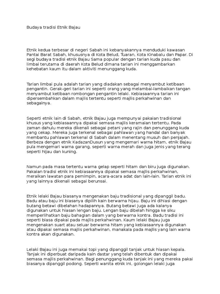 Adat kelahiran dan kematian suku kaum bajau kota belud. Adat perkahwinan kaum bajau kaum bajau adalah kaum pribumi sabah yang kedua terbesar selepas kaum kadazan dusun. Umumnya kaum ini tinggal di kawasan pantai dan bekerja sebagai nelayan di pantai sungai malah di kawasan pulau pulau yang berdekatan dengan penempatan mereka. Lelaki bajau menggayakan baju potongan cekak musang seluar samping dan destar manakala pasangan suku kaum bajau menggayakan pakaian adat perkahwinan dan kebesaran.