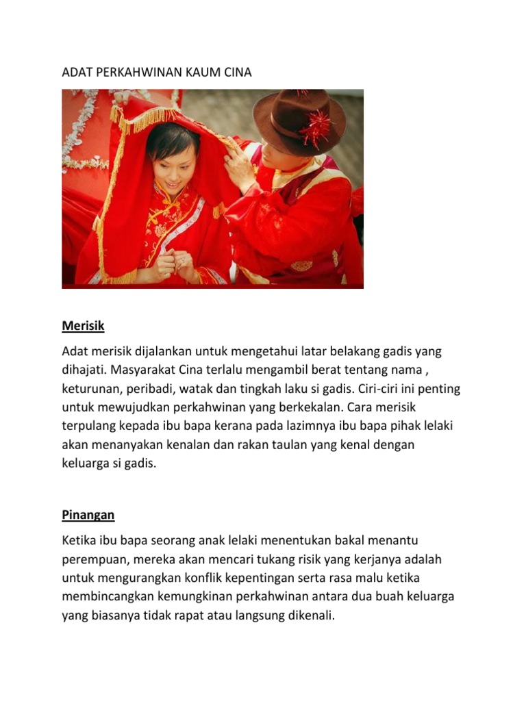 Masyarakat cina adalah kumpulan kaum kedua terbesar kat negara kita dan kita pun pastinya ada member yang berbangsa cina. Habib jewels dapatkan tips dan panduan tempah hotel dengan harga rendah di sini klik untuk pengetahuan anda tujuan merisik adalah untuk. Perkahwinan penting untuk mengekalkan institusi keluarga dan melaluinya keturunan nenek moyang dapat diteruskan daripada satu generasi kepada generasi yang lain. Perkahwinan cina menjadi satu adat resam antara tahun 402 221 sm.