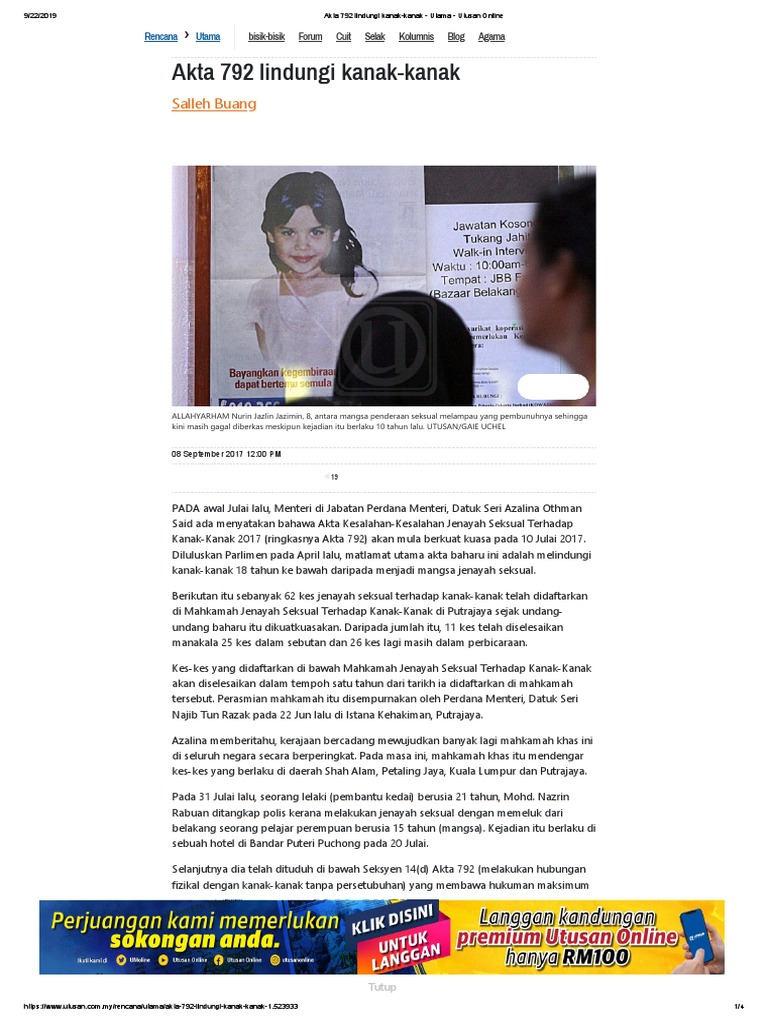 Dewan rakyat hari ini diberitahu pindaan akta kanak kanak 2001 akk 2001 yang dibuat pada 2016 adalah komprehensif bagi melindungi masalah penderaan kanak kanak di negara ini. Seksual terhadap kanak kanak 2017. Seksual terhadap kanak kanak 2017 akta 792 adalah tepat pada masanya apabila telah menambah baik kelompangan undang undang sedia ada berkaitan jenayah seksual terhadap kanak kanak. Undang undang malaysia akta 792 akta kesalahan kesalahan seksual terhadap kanak kanak 2017.