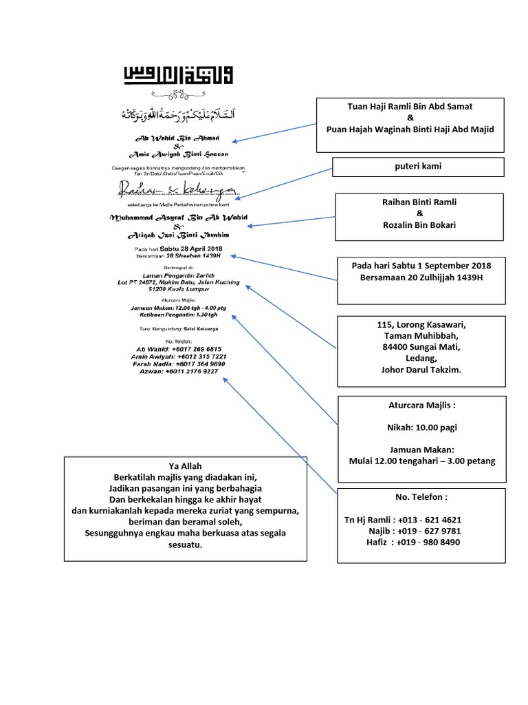 Alamat majlis kenduri serangkai kasih dalam limpahan budi menguntum segar dalam kenangan. Jika tidak boleh boleh tak saya tulis terjemahannya shj. Suami isteri sekeluarga ke majlis perkahwinan putera kami nama pengantin dengan nama pengantin pada hari tarikh majlis masihi bersamaan tarikh majlis hijrah di kediaman kami. بسم الله والحمد لله والصلاة والسلام على رسول الله وعلى آله وصحبه ومن والاه أما.