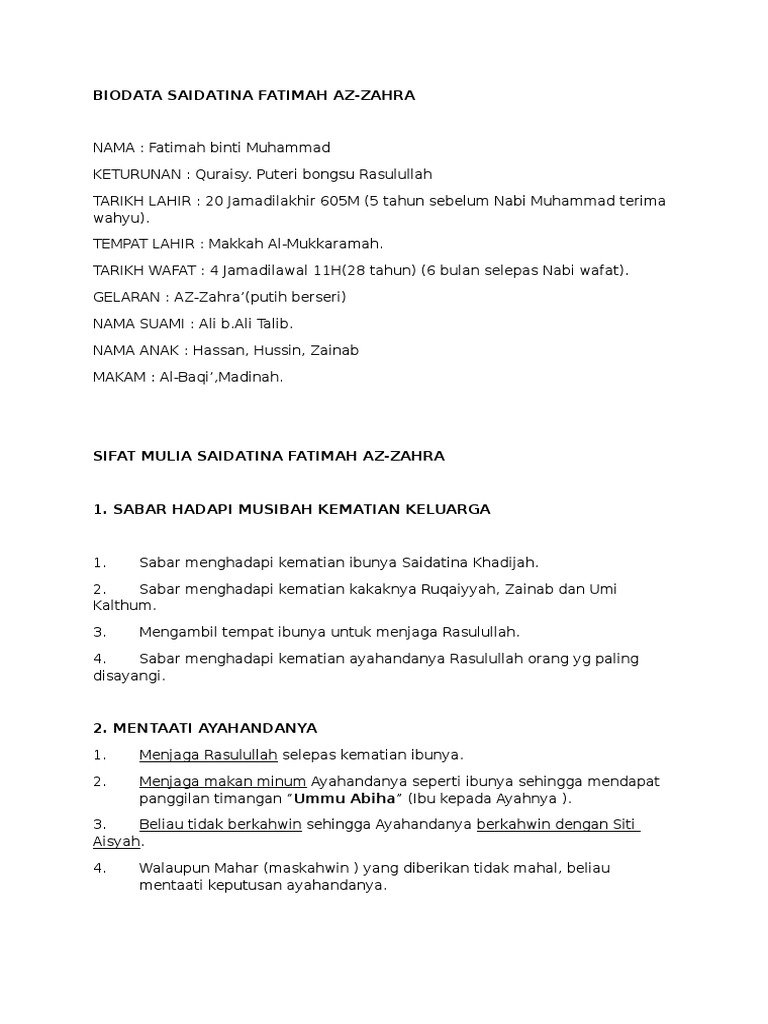 Biodata Saidatina Fatimah Al Zahra Ainul Folio Docx