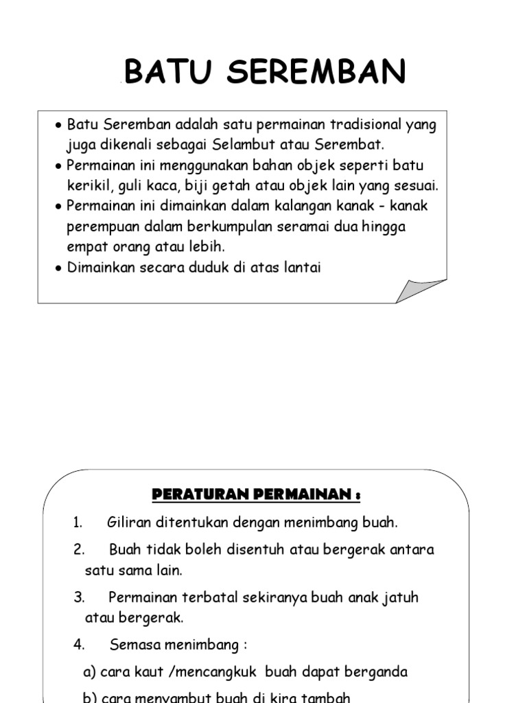 Batu seremban juga dikenali sebagai permainan selambut atau serembat. Objek objek seperti guli kaca biji getah ketulan batu kerikil sederhana besar atau ketulan ketulan objek lain yang berbentuk bulat digunakan dalam permainan ini. So apa kata anda buat kan permainan tradisional ini untuk diperkenalkan dengan mereka. Ia biasanya dimain secara berkumpulan dua orang atau lebih.