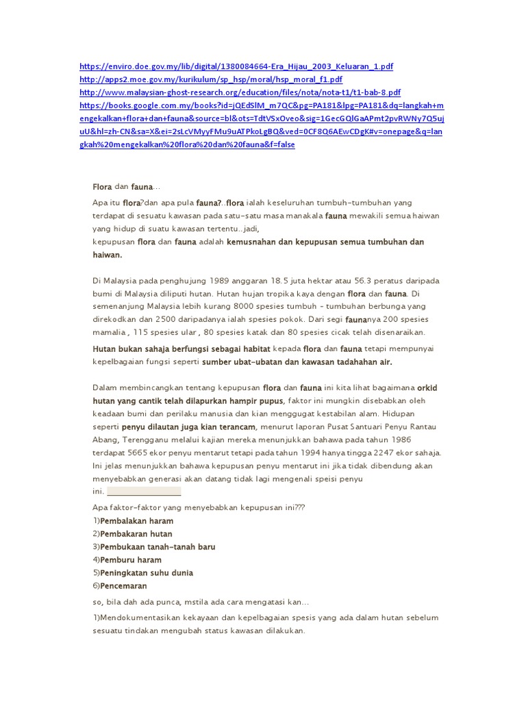 Cara mengatasi kepupusan flora dan fauna. Blog ini akan membincangkan tentang punca punca kepupusan flora dan fauna kesan kesan kepupusan dan langkah langkah yang dianggap sesuai untuk mengatasi masalah ini. Langkah untuk mengatasi masalah kepupusan flora dan fauna ialah menghenti kan pembalakan haram kerajaan juga seharusnya mengambil tindakan dengan mendenda mna mna. Berikut adalah penjelasannya. Kemusnahan dan perubahan habitat.