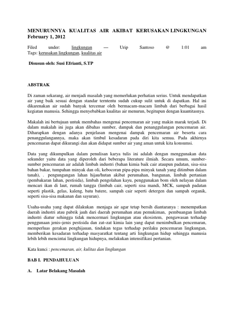 Intihanya kemusnahan dan pencemaran. Solusi pencemaran air dengan m embuang sampah pada tempatnya. Air menjadi penopang hidup bagi semua makhluk hidup. Langkah mengatasi pencemaran sungai tingkatan.