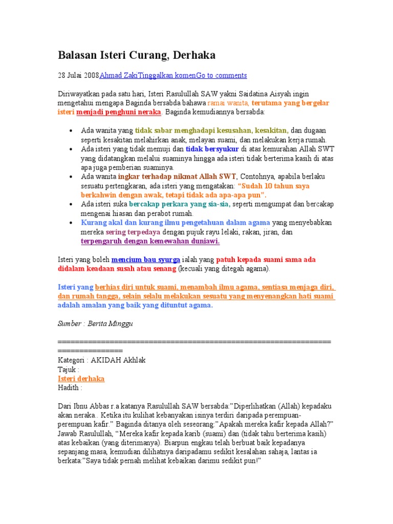 Seorang isteri yang menderhakai suaminya adalah amat dibenci oleh allah swt. Ertinya sesudah berikhtiar semampu mungkin maka selepas itu terpulanglah pada allah apa yang hendak ditakdirkannya. Kita jangan keliru apabila wanita disebut sebagai isteri bukanlah untuk merendahkan taraf wanita itu. Ciri ciri isteri derhaka menurut rasullullah saw.