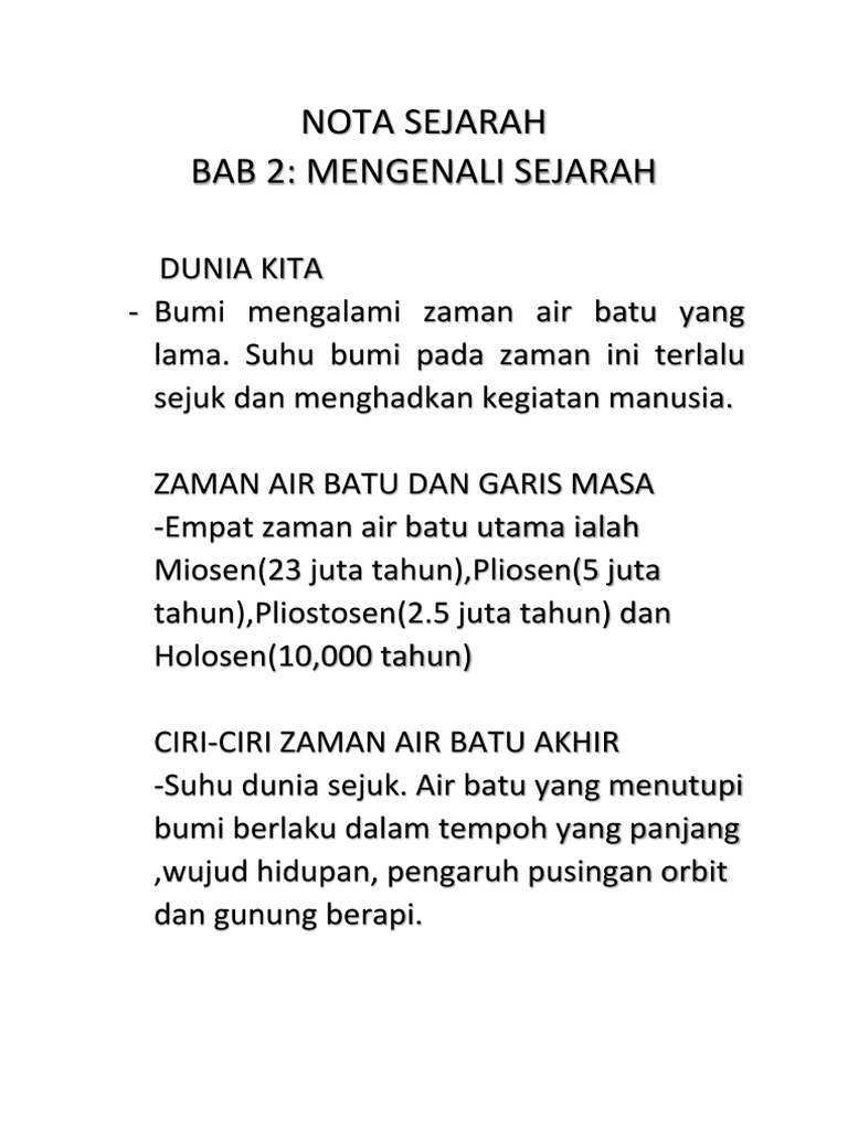 2 2 zaman air batu a zaman air batu ialah garis masa geologi yang menunjukkan suhu bumi menurun b pada akhir zaman air batu bumi mengalami proses pengglasieran c perubahan iklim dunia kepada suhu panas telah menyebabkan berakhirnya zaman air batu 1 zaman miosen berlaku antara 23 juta hingga 5 juta tahun dahulu. Ciri ciri zaman air batu akhir ciri fizikal bumi permukaan air laut yang membeku menyebabkan sebahagian besar bumi dilitupi salji binatang binatang seperti mamot berbulu badak kuda dan singa tinggal di kawasan tanah pamah yang sejuk. Zaman miosen ciri fizikal bumi tumbuhan utama ialah rumput dan tumbuhan renek yang menjalar terdapat manusia yang tinggal di kawasan tanah pamah yang sejuk mereka memburu. Ciri ciri zaman air batu akhir.